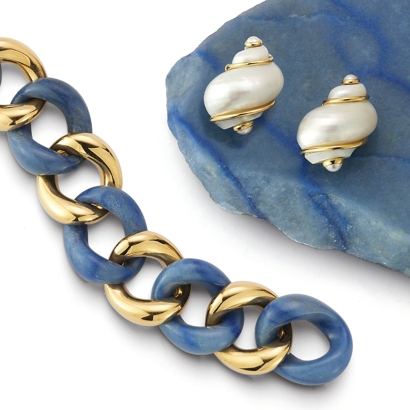 The soft blue colors of this naturally occurring stone offer a warm welcome to a joyful summer. The finest rich blue specimens of this material are found in Brazil and India, where it has been long admired for its healing and spiritual properties. Traditionally associated with opening the third eye chakra, it is believed to promote inner peace, prosperity, and a sense of purpose. Hand carved Blue Aventurine presents a refreshing new color way to our signature link bracelets and enhances our shell pendants and earrings. We invite you to visit our shops to view these beautifully crafted, signed and numbered pieces.