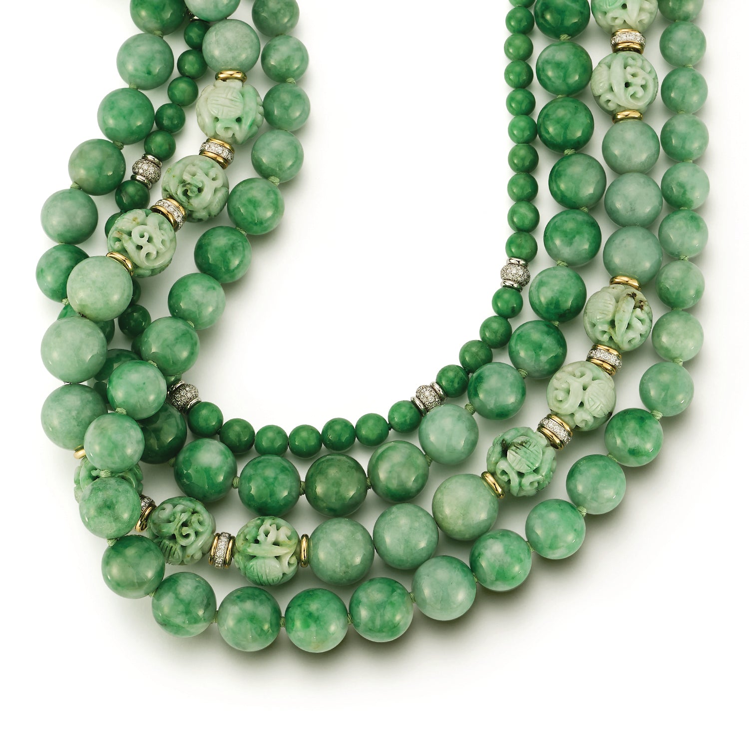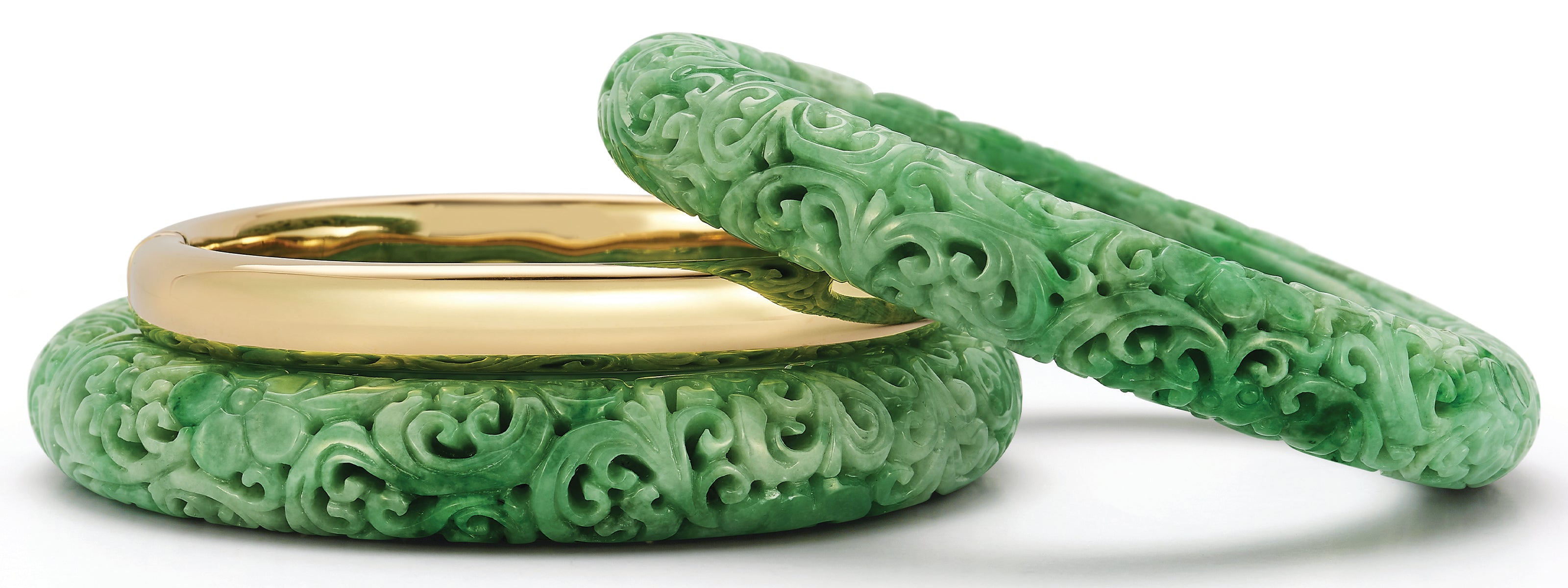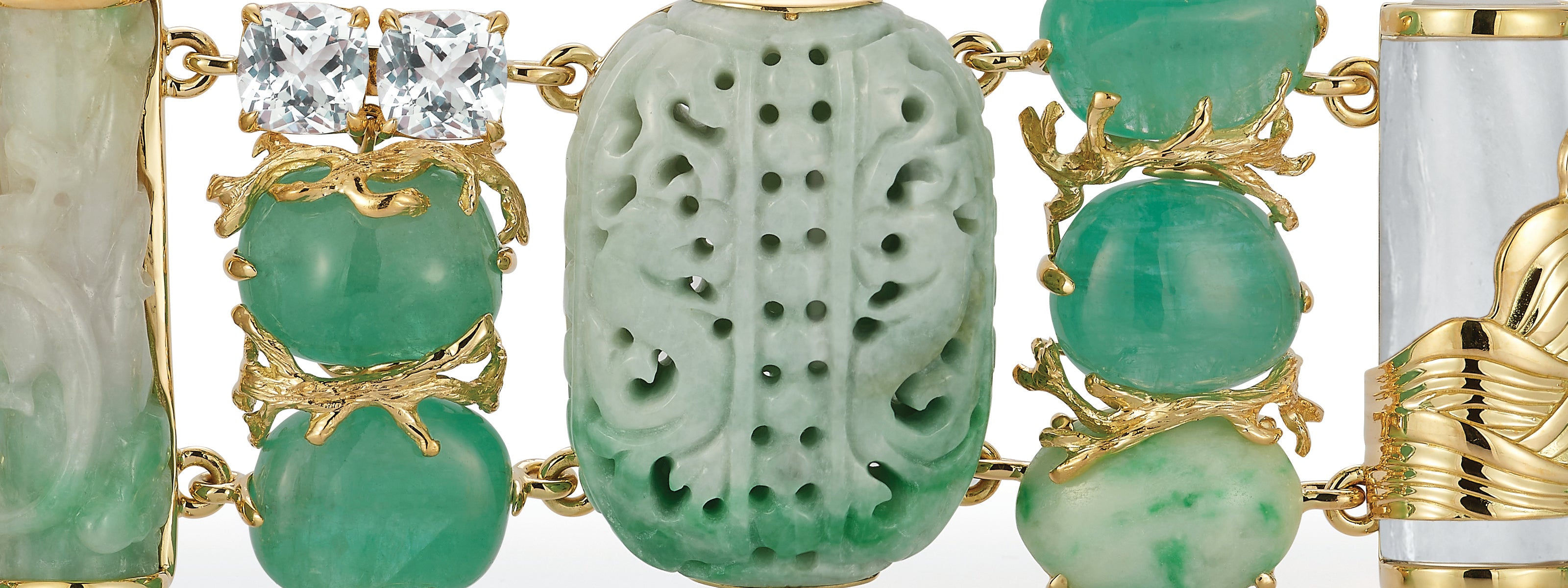 The more valuable Jadeite possesses a rich apple green translucency, and can also be found in tawny brown, lavender, and milky white tones.
